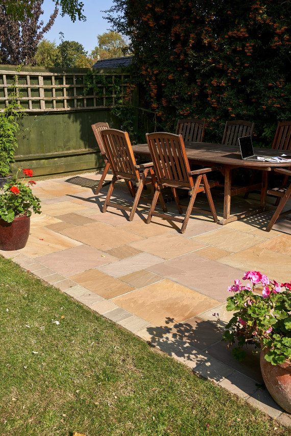 This premium Country Buff sandstone paving is gently riven in texture and each piece is handpicked and cut, with the natural variation in tones and natural veining, which means that each piece is absolutely unique. Together, they combine to make a beautiful blend of colours and overall tone.