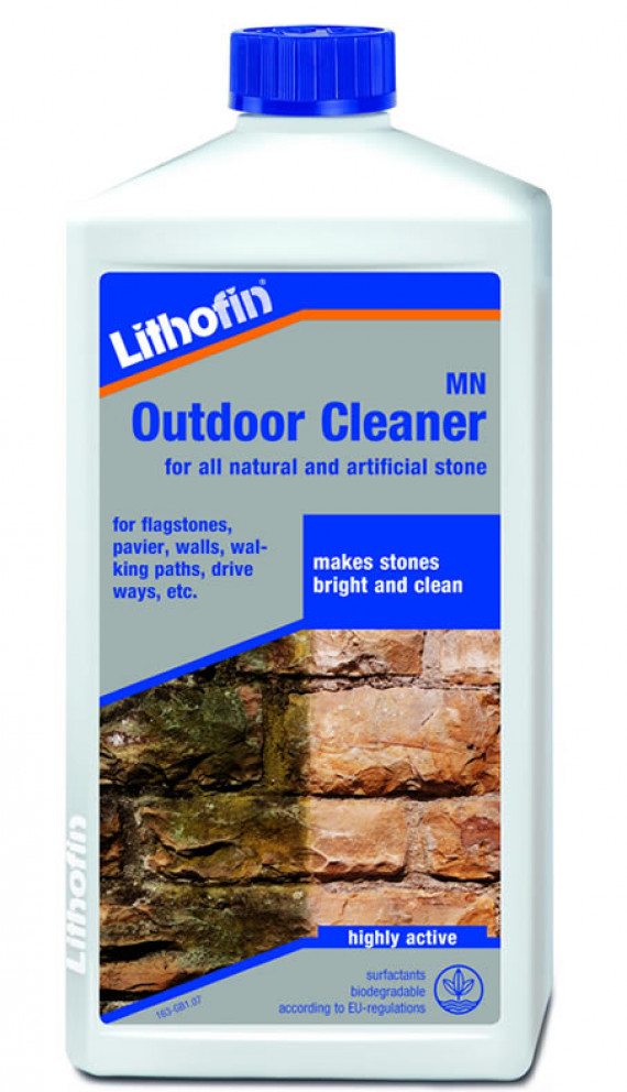 Use a garden sprayer to apply Lithofin MN Outdoor Cleaner generously in undiluted form. Allow the product to work for up to 4 hours. Brush the surface and rinse with clear water. In very stubborn cases, repeat this procedure.