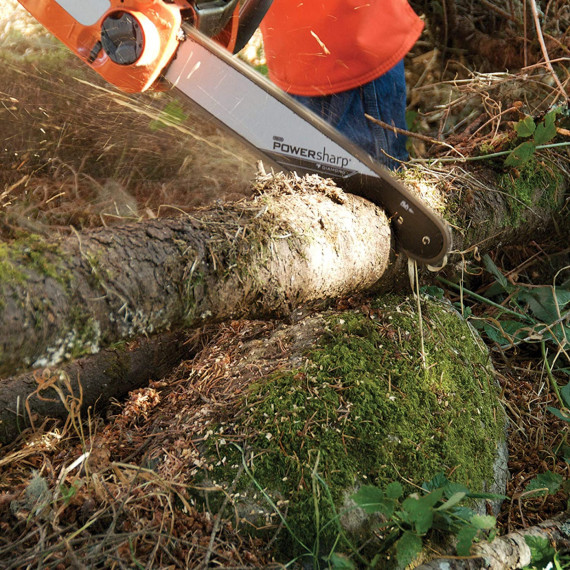 The Oregon PowerSharp bar allows you to quickly and easily sharpen chain while still on the saw, whilst other chain types require you to manually file and grind chain to maintain sharpness. Go from dull to sharp in just three seconds.