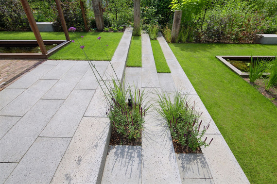 Schellevis concrete steps are available in two models. The block model has a slightly rounded bevelled top on one side and is available in corner pieces. You also have the L-shaped model which has a short upstanding edge on the top. These are both fantastic for bridging between elevations in gardens.
